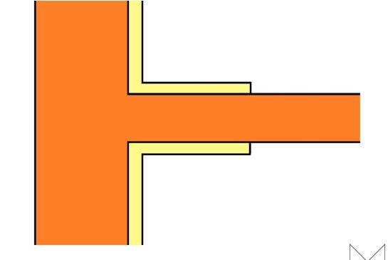 Bij de aansluiting van binnenwanden op een massieve buitenmuur, ontstaan ook koudebruggen omdat het isolatiemateriaal hier niet kan worden doorgezet. Bij het koudere vlak kan dan vervolgens condensvorming en schimmel optreden. Als oplossing zou de binnenwand bij de aansluiting op de buitenmuur aan weerszijden met isolatiemateriaal kunnen worden bekleed. In de regel is 500 mm doorzetten van het isolatiemateriaal tegen de binnenwand afdoende. Bij lichte, niet dragende, scheidingswanden kan de wand eventueel worden losgehaald van de buitenmuur en het isolatiemateriaal worden doorgezet.